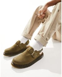 Go to SSENSESuede slip-on mules in black. · Logo tag at convertible pin-buckle strap · Elasticized gusset at inner side · Buffed leather lining · Padded suede footbed · Yellow topstitching at heat-sealed Goodyear welt