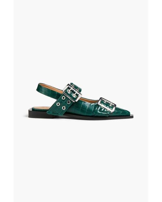 Women's Green Buckled Croc-effect Slingback Point-toe Flats