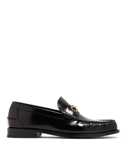Medusa '95 leather loafers black calf leather slip-on style Medusa plaque detail gold-tone hardware round toe leather sole Size: 38. Gender: Male. Material:Calf Leather/Calf Leather/Calf Leather.