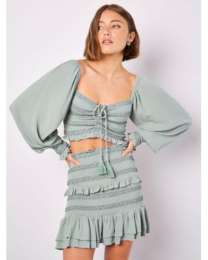 Exclusive Broderie Shirred Tie Tassel Detail Crop Top Co-ord - Natural