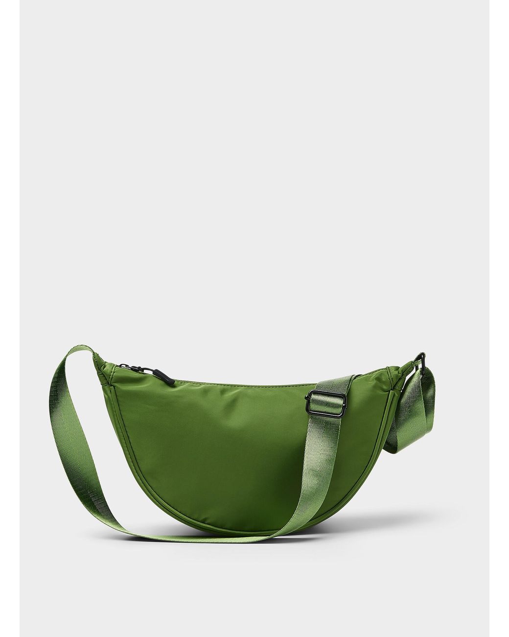Accessories > Women > Bagsbr>Simons - Half-moon crossbody bag Simonsbr>b>A Simons exclusive designed in Canada/b>br>ul>li>Recycled polyester fabric/li>li>Recycled polyester lining/li>li>Zip on top/li>li>Adjustable crossbody strap/li>li>Two slit pockets inside/li>/ul>br>Height: 6.25" (16 cm)br>Length: 13.5" (34 cm)br>Width: 3.5" (9 cm). Colour: green
