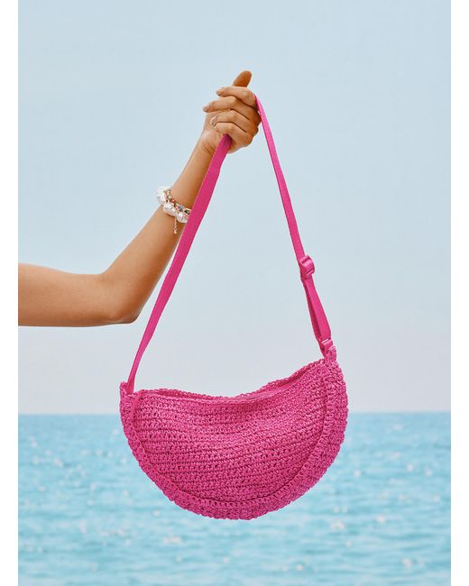 Accessories > Women > Bagsbr>Simons - Half-moon braided straw crossbody bag Simonsbr>b>Simons exclusive/b>br>ul>li>Braided paper straw/li>li>Fabric lining/li>li>Zip on top/li>li>Adjustable web crossbody strap/li>li>Two slit pockets inside/li>/ul>br>Height: 6.75" (17 cm)br>Length: 12" (30.5 cm)br>Width: 3.5" (9 cm). Colour: pink