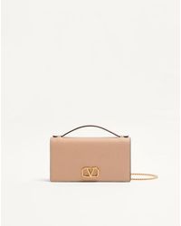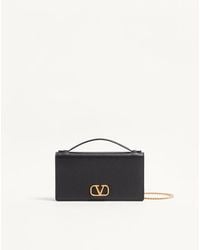 Go to Valentino GaravaniDesigner VLogo Signature velvet chain wallet with jewel logo. The accessory can be handheld or may be worn crossbody or over the shoulder thanks to the handle and the detachable chain. Antique brass