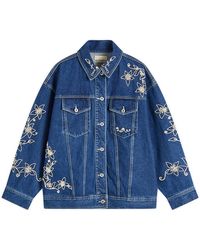 Go to FARFETCHMedium blue cotton washed denim concealed fly and button fastening contrast stitching floral embroidery mid-rise belt loops classic five pockets straight leg Size: 10. Gender: Female. Material:Cotton. Colour: blue
