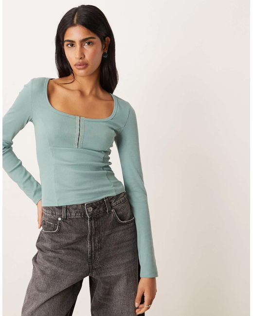 Women's Green Scoop Neck Long Sleeve Top With Seam Detail