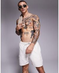 Short length swim shorts by asos. Drawstring waistband. Mesh lining. Side pockets. Single back pocket. Machine wash. 100% polyester. Outseam measures approximately 35.5cm/14" in length. About asos brand designed in-house in our london