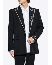Go to FARFETCHWhite/black crepe texture stretch-design double-breasted button fastening peak lapels slogan print shoulder pads long sleeves button-fastening chest pocket two front flap pockets buttoned cuffs straight hem Size: 48. Gender: Male. Material:Elastane/Viscose. Colour: white