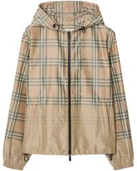 Go to TESSABITThe Check Jacket by Burberry is a sophisticated outerwear piece designed for the modern man. Featuring a drawcord hood and side zip pockets, it combines functionality with a sleek aesthetic. The elasticated cuffs