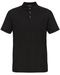 Go to BaltiniPartial covered front placket. Ribbed polo collar. Short sleeves, ribbed cuffs. Tone-on-tone micro eagle embroidery at chest. Side slits at bottom; straight hem. Regular fit. Black colour. 100% Cotton. Made in Türkiye. Gender: