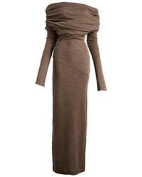 Go to FARFETCHLight grey stretch-design jersey texture gathered detailing draped detailing long sleeves thigh-length unlined asymmetric hem pull-on style Size: M. Gender: Female. Material:Viscose/Elastane. Colour: white