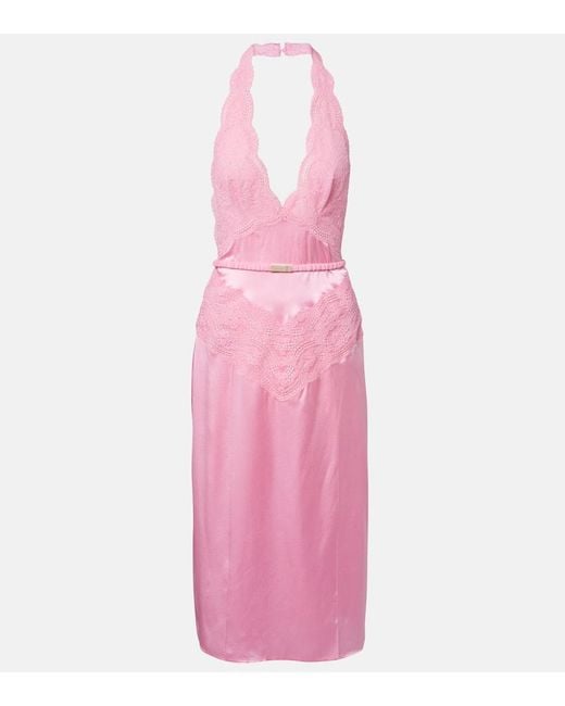 Women's Pink Lace-Trimmed Silk Satin Midi Dress