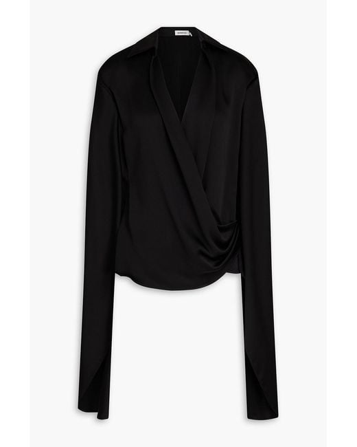 Women's Black Wrap-effect Draped Satin-crepe Top