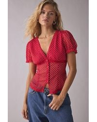 Motel Women's Red Ulsan Polka Dot Puff Sleeve Button-Down Blouse