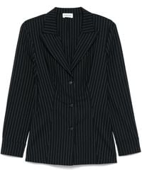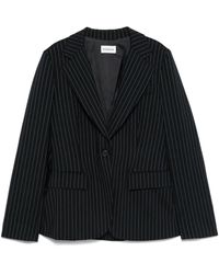 Go to BalardiA single-breasted blazer from P.A.R.O.S.H. presents a deep navy blue colour enhanced by fine white pinstripes. Structured shoulders complement a classic notch lapel and a single button closure, creating a timeless silhouette. A