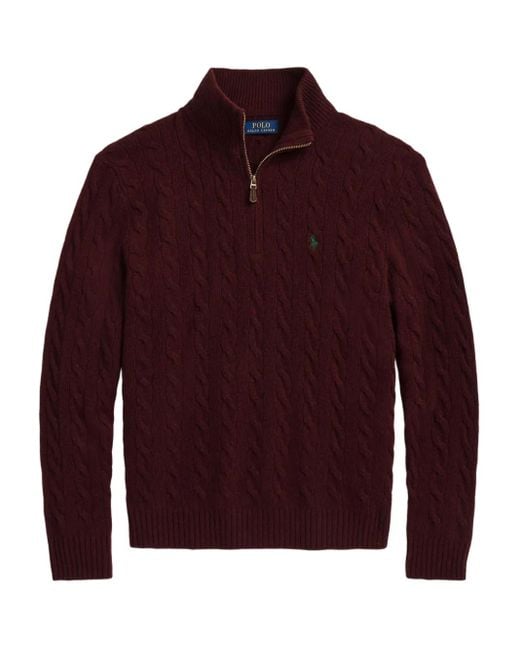Men's Red Cashmere Blend Quarter Zip Cable Knit Sweater