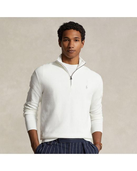 Men's White Mesh-Knit Cotton Quarter-Zip Sweater