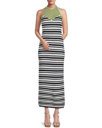 Go to Bloomingdale'sRamy Brook Skye Striped Knit Dress.Color:Spring Navy.Size:M.Material:56% polyester/31% cotton/11% viscose/2% elastane; combo: 95% polyester/5% nylon.Dresses.