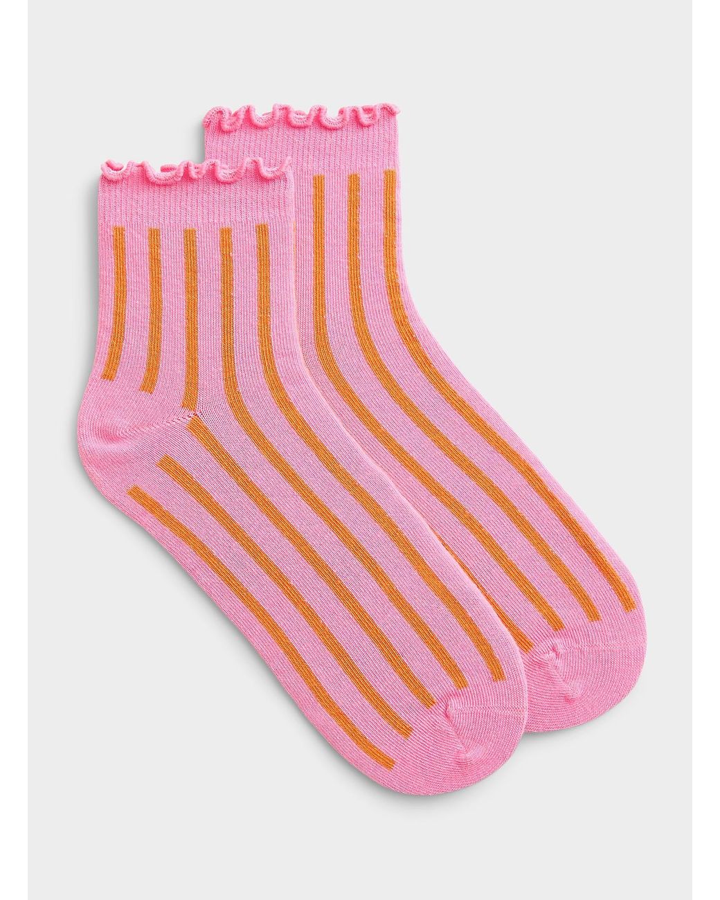 Underwear & Loungewear > Women > Socksbr>Simons - Vertical-pinstripe socks Simonsbr>b>A Simons exclusive designed in Canada/b>br>ul>li>Fine knit in an ultra-comfortable stretch blend of polyester and organic cotton/li>li>Ruffled elastic cuff/li>/ul>. Colour: pink
