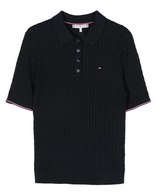 Women's Black Textured Knit Polo Shirt With Contrast Stripes