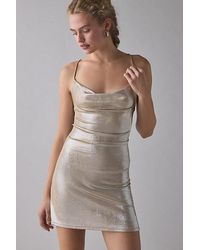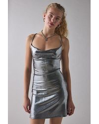 Go to Urban OutfittersNeed-now UO romper in a mini, a-line silhouette. Designed in a slink knit featuring a cowl v-neckline, draped drop-waist bodice and ruched mini overskirt. Finished with built-in shorts for a versatile look. Only