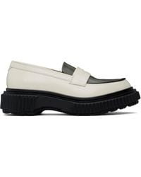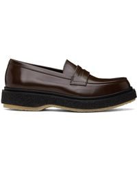 Go to SSENSEPolished leather loafers in brown and off-white. · Perforated and serrated detailing throughout · Moc toe · Strap with cutout at vamp · Buffed leather and suede lining · Logo stamp at padded