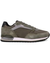 Go to SSENSELow-top suede sneakers in navy. · Lace-up closure · Logo embossed at padded tongue · Padded collar · Logo stamp at outer side · Eyelets at inner side · Logo flag at heel