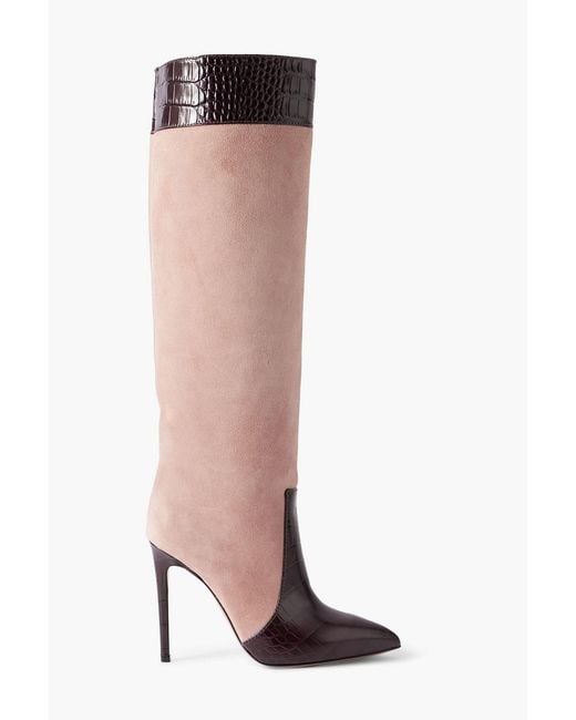 - Croc-Effect Leather-Trimmed Suede Knee-High Boots