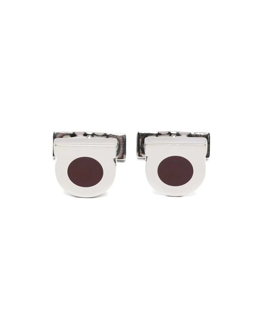 Gemelos Ferragamo con cierre de barra en T plateado y detalle del logo en rojo, diseñados para añadir un toque sutil de marca a la vestimenta formal. Atributos clave: Gris | Plata | Rojo | Cierre de barra en T | Detalle del logo en rojo | Acabado plateado Color: gris