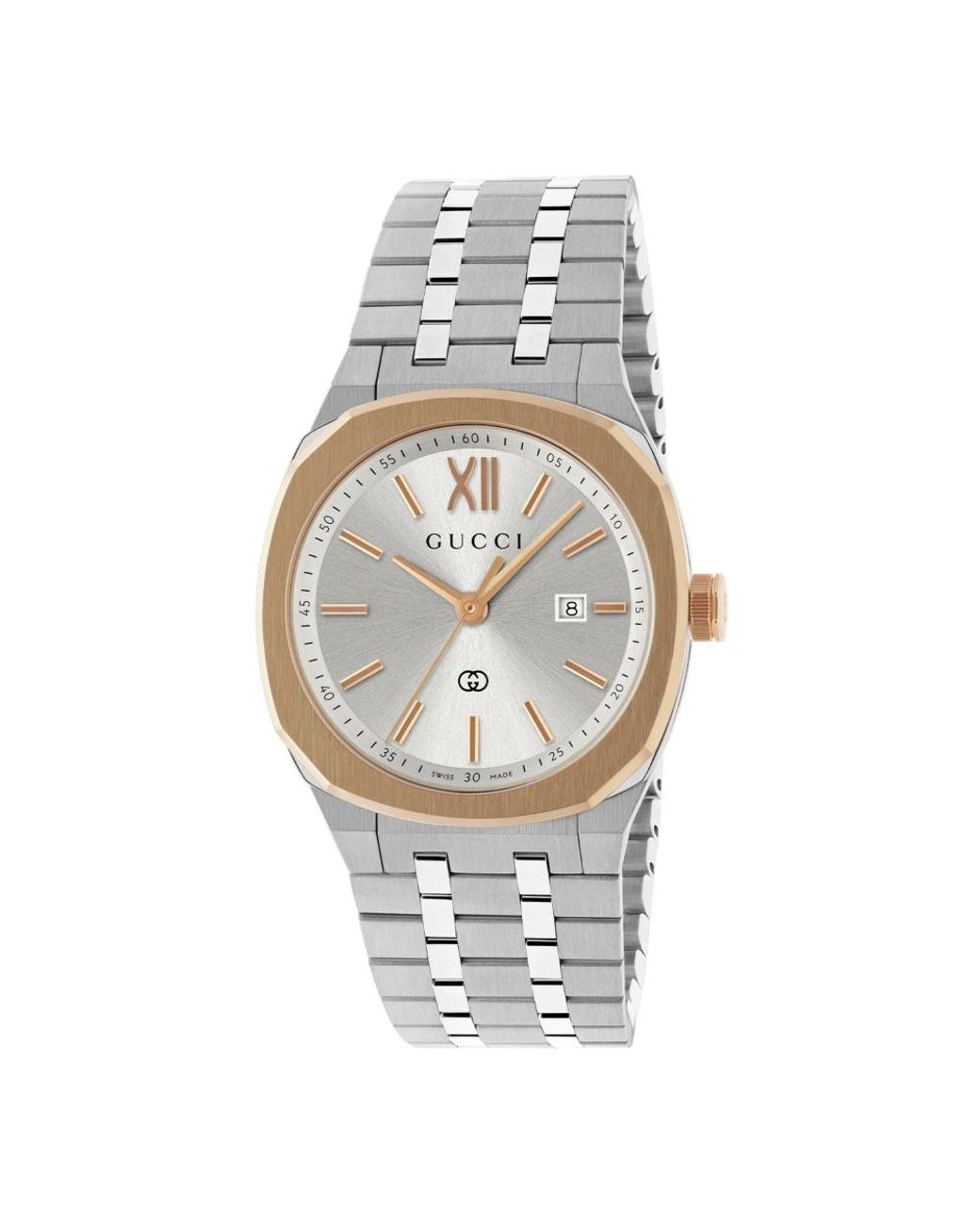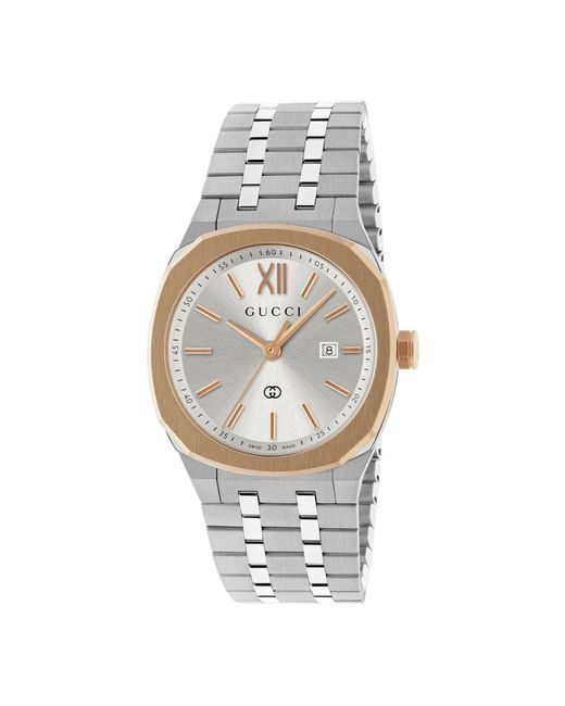 ¡Aprovecha las mejores rebajas! Eleva tu estilo con este reloj Gucci para mujeres. Con cristal de zafiro y correa de acero inoxidable, este reloj es resistente al agua hasta 5 atm (50 metros/164 pies). Color: metálico
