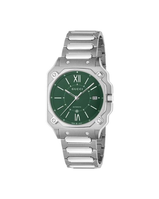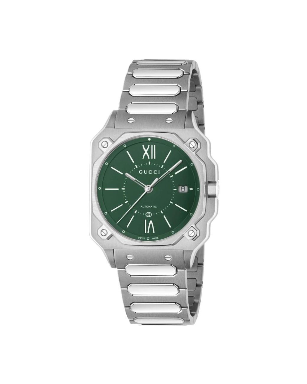 ¡Aprovecha las mejores rebajas! El reloj Gucci G-Flat es un reloj de pulsera de acero inoxidable de 36 mm que combina una caja octogonal con una esfera de color verde opaline para una elegancia cotidiana. Cuenta con un movimiento automático fiable y una práctica visualización de la fecha para un uso versátil. Atributos clave: Verde | Unicolor | Acero inoxidable | Resistente al agua 5 ATM (50 metros/164 pies) | Cristal de zafiro con revestimiento antirreflectante | Movimiento automático con reserva de marcha de 50 horas | Brazalete integrado de acero inoxidable | Cierre plegable | Indicador de fecha | Caja octogonal | Esfera verde opaline | Números romanos a las 12 y a las 6 | Ventana de fecha a las 3 en punto | Dimensiones y ajuste: Diámetro de la caja: 36 mm | Tamaño de la muñeca: 145 mm a 200 mm | Ajuste de brazalete ajustable: se adapta a tamaños de muñeca de 145 mm a 200 mm | Composición y cuidado: Acero inoxidable | Cristal de zafiro | Evite los campos magnéticos fuertes y los impactos. Evite el contacto con disolventes, detergentes, perfumes y temperaturas extremas. Limpiar con un paño suave. Resistencia al agua hasta 5 ATM (50 m). Color: verde