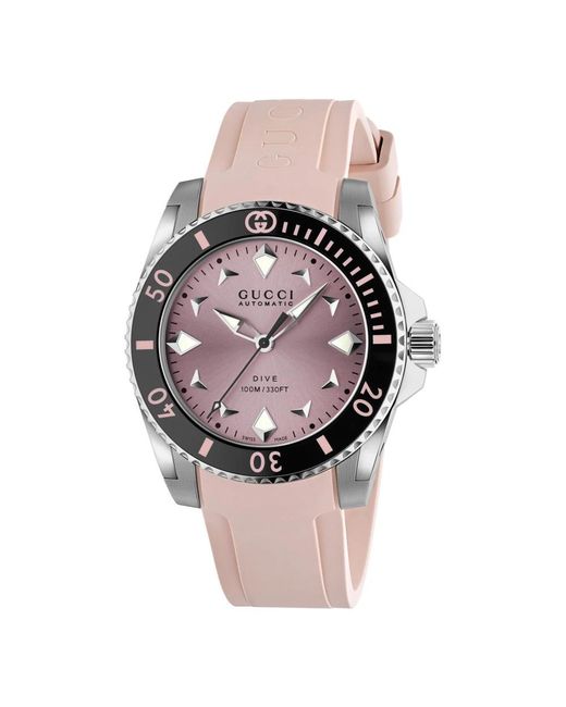 ¡Aprovecha las mejores rebajas! El reloj Gucci Dive de 36 mm combina el rendimiento de estilo buzo con una vibrante esfera rosa y una duradera correa de caucho, aunando una resistencia al agua fiable con un estilo deportivo para el día a día. Características principales: Rosa | Negro | Acero inoxidable | Resistente al agua hasta 10 ATM (100 metros) | Cristal de zafiro | Movimiento automático con reserva de marcha de 38 horas | Correa de caucho con hebilla plegable | Bisel de cerámica negra | Correa ajustable (para muñecas de 140–185 mm) | Caja de 36 mm | Diseño estilo buzo | Esfera rosa | Dimensiones y ajuste: Diámetro de la caja: 36 mm | Se adapta a muñecas de: 140–185 mm | Correa ajustable para una gran variedad de tamaños de muñeca | La caja de 36 mm ofrece un ajuste de tamaño mediano | Composición y cuidado: Caja de acero inoxidable | Correa de caucho | Cristal de zafiro | Bisel de cerámica | Limpiar con un paño suave; evitar los productos químicos y la exposición prolongada al agua salada; llevar a reparar a un centro de servicio autorizado según sea necesario. Color: rosa