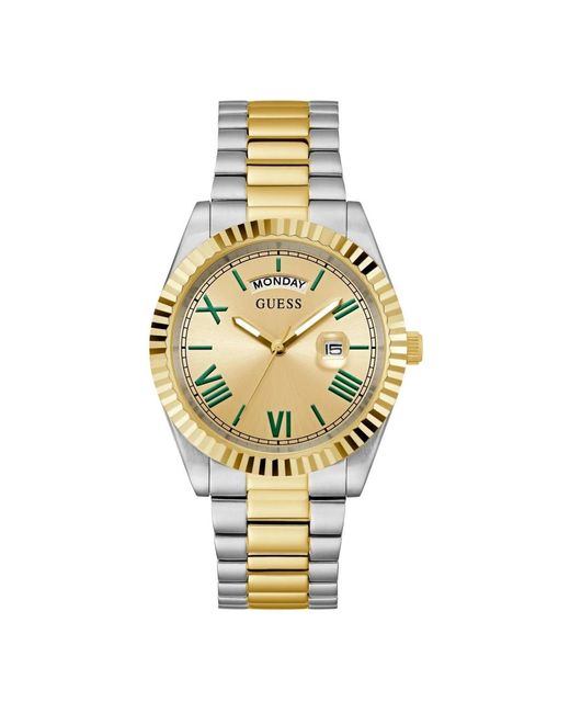 Descubre la elegancia del reloj Guess de dos tonos GD Connoisseur, con una sofisticada esfera champán y llamativos números romanos verdes. Características clave: Amarillo | Verde | Acero inoxidable | Resistente al agua hasta 5 ATM | Cierre desplegable | Esfera champán | Números romanos verdes | Composición y cuidado: Limpiar con un paño húmedo. Color: metálico