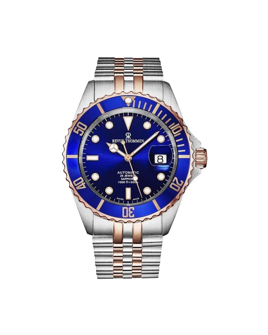 ¡Aprovecha las mejores rebajas! Descubre el reloj Revue Thommen Diver para hombres, con una pulsera de acero inoxidable en tonos plateados y oro rosa. El dial azul y el cristal de zafiro añaden un toque de elegancia a este reloj automático. Con una resistencia al agua de 30 Atm, este reloj incluye funciones de hora, minuto y segundo, así como un calendario diario. Destaca con índices luminosos y agujas. Tamaño de la caja: 42 mm, ancho de la pulsera: 22 mm. Ean: 7611751179797.