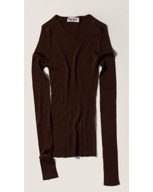 Desde su fundación en 1993, la casa de moda italiana Miu Miu goza de reconocimiento por su innovación y creatividad. Las colecciones de Miu Miu, sensuales, rebeldes y de estilo despreocupado, combinan la filosofía parisina del savoir-faire con un sentido experimental. Las prendas de punto de Miu Miu combinan el lujo y la elegancia. Hermosos tejidos de cachemira con botones de cristal de Swarovski, cárdigan de lana de dos tonos y jerséis suaves con estampados geométricos son algunas de las propuestas más destacadas.
