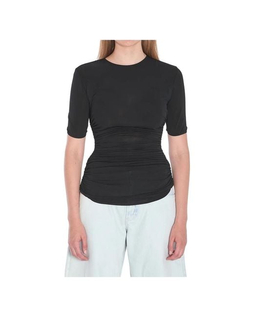 La camiseta de viscosa de Alaïa combina un cuello redondo clásico y mangas cortas con una cintura fruncida para una silueta definida y femenina. El sutil detalle plisado añade movimiento, mientras que el tejido de punto de viscosa y elastano ofrece una elasticidad cómoda. Atributos clave: Black | Negro | Viscosa | Tejido elástico | Cuello redondo | Mangas cortas | Cintura fruncida | Detalle plisado | Composición y cuidado: 96% viscosa | 4% elastano Color: negro