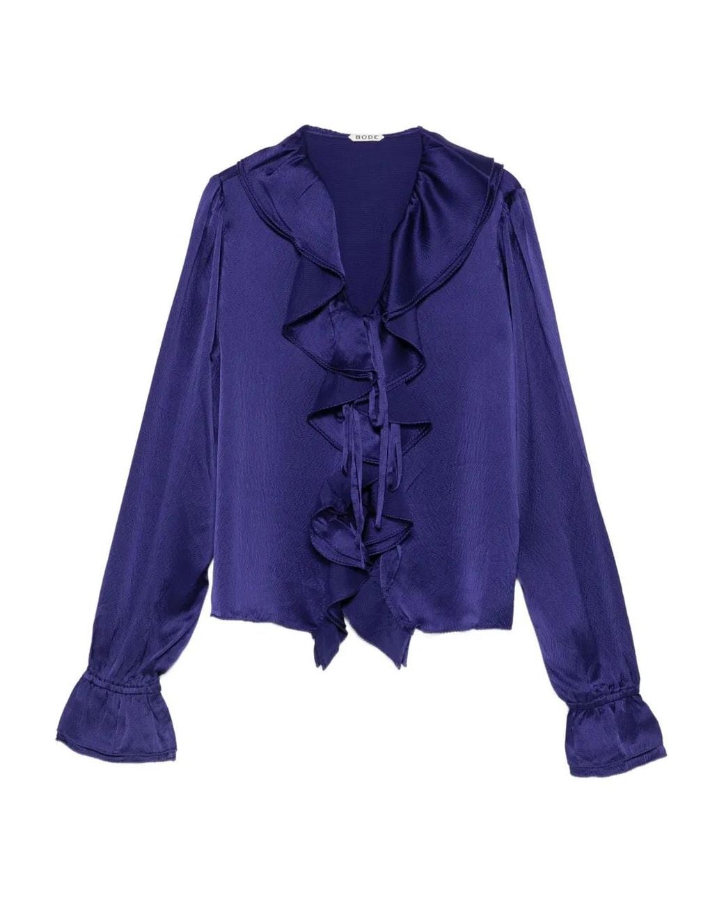 Púrpura ribete con volantes detalle de lazo manga larga puños elásticos cuello en V Size: M. Gender: Female. Material:Seda. Color: azul