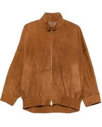 Visitar BalardiChaqueta hecha de cuero de gamuza. Diseño de paneles asimétricos. Cierre lateral con hebilla de metal. Bolsillo del pecho con cierre de ribete. Marrón. Hecho en Italia. Composición: 100% de piel de cordero,