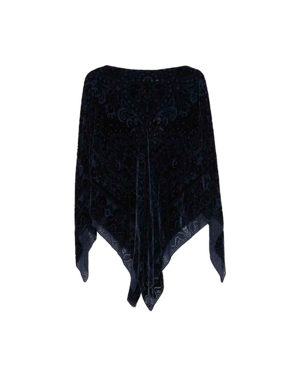 Eleva tu estilo con esta chaqueta capa de Etro en terciopelo azul oscuro con estampado paisley y dobladillo triangular. Hecho de 50% seda y 50% viscosa. Color: negro