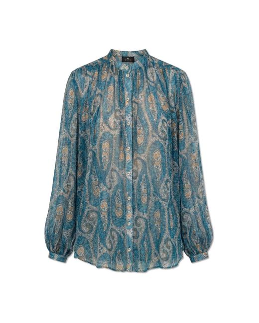 La camisa de seda Etro combina el característico estampado ornamental de cachemir de la casa con una seda ligera y semitransparente que cae con un brillo sutil. Diseñada para un uso refinado de día y de noche, destaca un cuello alzado fruncido y elegantes puños abotonados. Atributos clave: Azul | Seda | Ligera | Semitransparente | Brillo sutil | Mangas largas | Puños abotonados | Cuello alzado fruncido | Estampado ornamental de cachemir | Delicados frunces en los hombros | Diseño discreto sin logotipos | Dimensiones y ajuste: Corte holgado, ligeramente oversize | Fruncido en hombros y cuello para mayor volumen | Composición y cuidado: Seda Color: azul