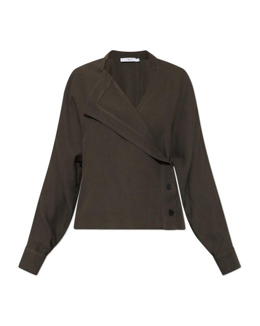 El top IRO Paquita es una blusa moderna estilo cruzado que combina un frente asimétrico con un distintivo cierre de botones diagonal. Diseñado para ofrecer una caída suave y detalles refinados, es adecuado tanto para looks diurnos elegantes como para outfits de noche sofisticados. Atributos clave: Verde militar | Viscosa | Lana | Caída suave | Acabado con textura mate | Uso cómodo | Cintura elástica en la parte trasera | Cierre de tres botones en el lado izquierdo | Puños de manga abotonados | Frente asimétrico | Pliegues en el busto | Escote pronunciado en forma de V | Tapeta decorativa ancha | Cierre diagonal | Botones negros visibles | Mangas largas con puños abotonados | Dimensiones y ajuste: Altura: 176 cm | Busto: 85 cm | Cintura: 60 cm | Caderas: 89 cm | La modelo lleva la talla: 36 | Composición y cuidado: 95% viscosa | 5% lana Color: gris