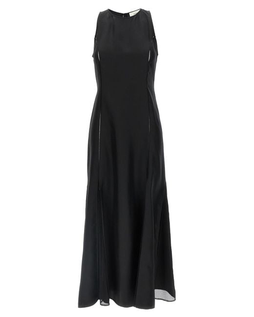 Vestido midi de sarga de seda 'Iraka' con aplicaciones de punto de encaje, falda de vuelo con aplicaciones de tul de malla, escote redondo, sin mangas y cierre de cremallera en la espalda. LOULOU DE TEMPORADA. Vestido 'Iraka'. Ajuste fiel al tamaño. Color: negro