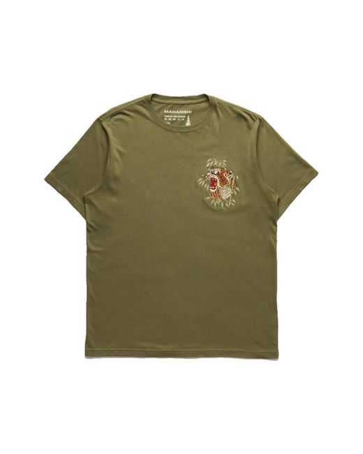 ¡Aprovecha las mejores rebajas! Camiseta de manga corta en color verde oliva, con bordado Bamboo Tiger. Se dice que el tigre, símbolo de determinación, es una de las pocas especies capaces de abrirse camino a través de un bosque de bambú. El animal que se vuelve uno con las densas ramas representa una sociedad armoniosa. Jersey de algodón orgánico Bordado de tigre de bambú 190gsm · 100% Algodón El uso perenne del algodón orgánico tiene como objetivo crear conciencia y contribuir a la reducción del uso de pesticidas en la producción de prendas de vestir. Cada colección de Maharishi utiliza sudor y camisetas cultivadas sin pesticidas tóxicos ni fertilizantes sintéticos. Color: verde