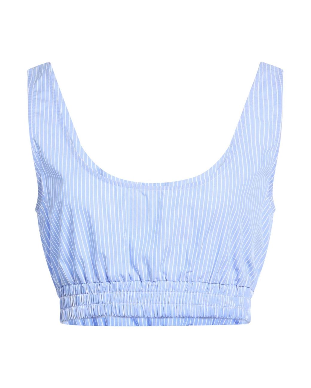 MODES. top tipo crop, tejido, estampado a rayas, sin aplicaciones, escote profundo, sin mangas , ajuste con elástico, lavado a mano o limpieza en seco, no lavar con lejía , no secar en secadora. 100% Algodón. Color: azul