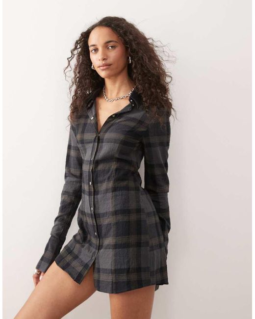 Vestido Camisero Corto Gris Oscuro A Cuadros De Manga Larga Con Cintura Entallada De