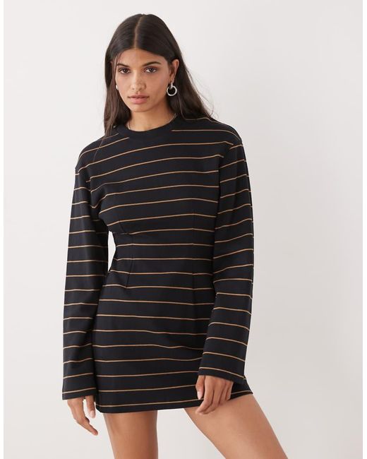 Vestido Corto A Rayas Estilo Camiseta De Manga Larga Con Cintura Entallada De de mujer de color negro