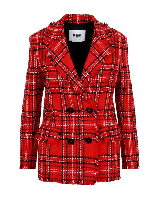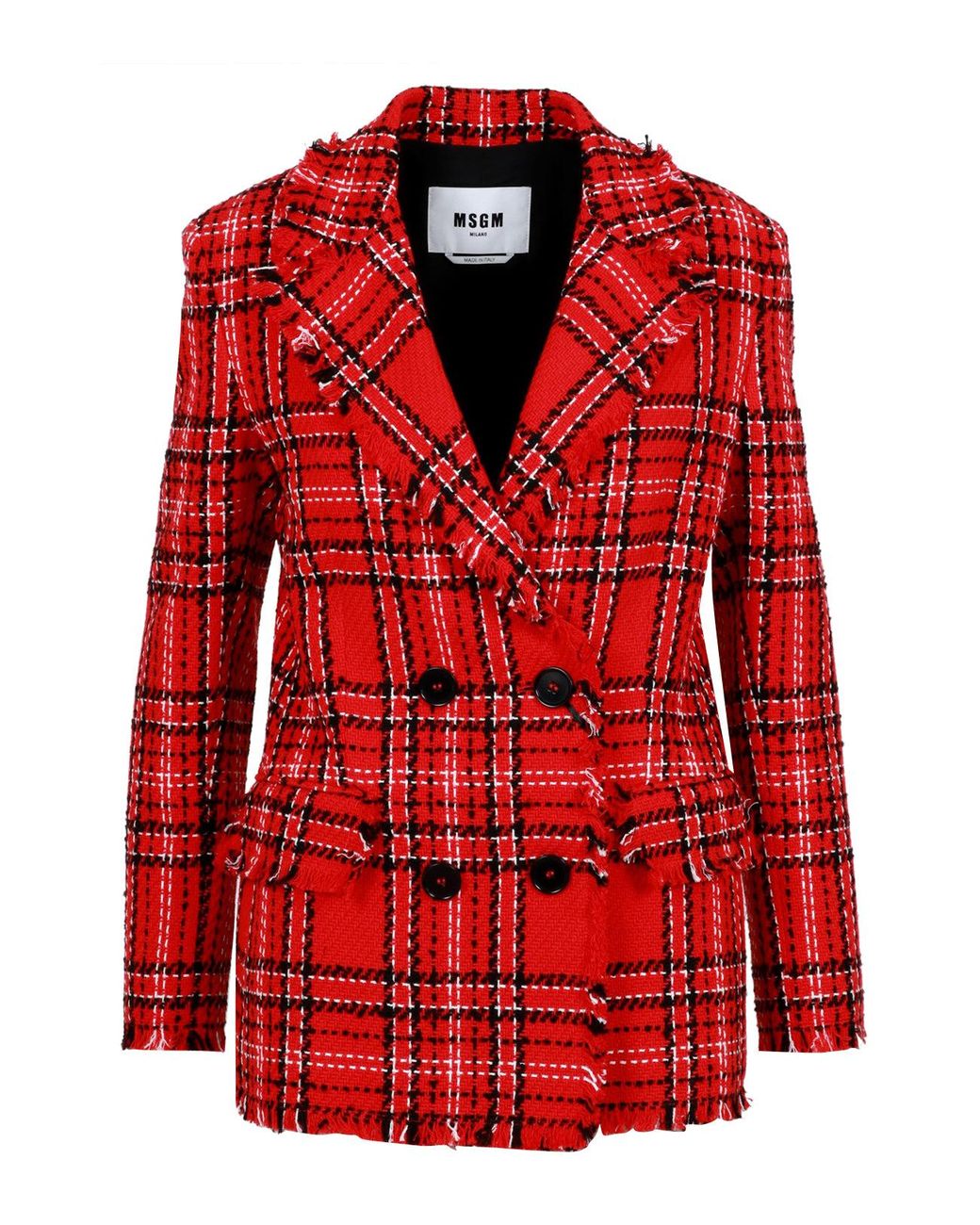 Tweed de algodón - Patrón de doble pecho - Patrón de tartán - Collar de dientes - Escote profundo - Mangas largas con extremos de botones - bolsillos de aleta con bordes deshilachados - hombros acolchados - tubería de prenda deshilachada - ajuste regular. Color: rojo