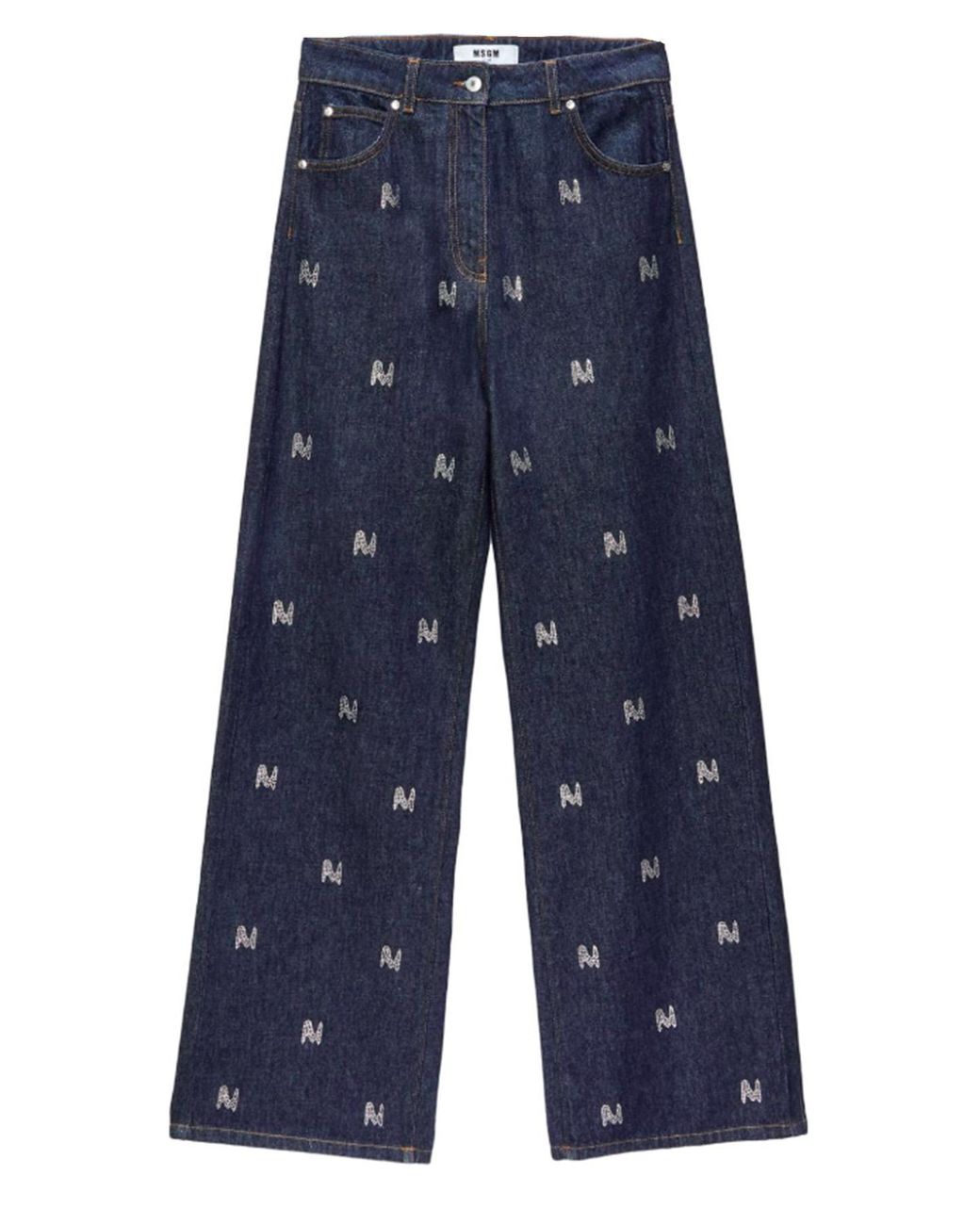Algodon, modelo denim, decoracion de strass, aplicacion de logo, trabillas, cierre oculto con boton y cremallera, pernera ancha, diseno clasico de cinco bolsillos. Composicion 100% algodon Made in Italy Color: azul