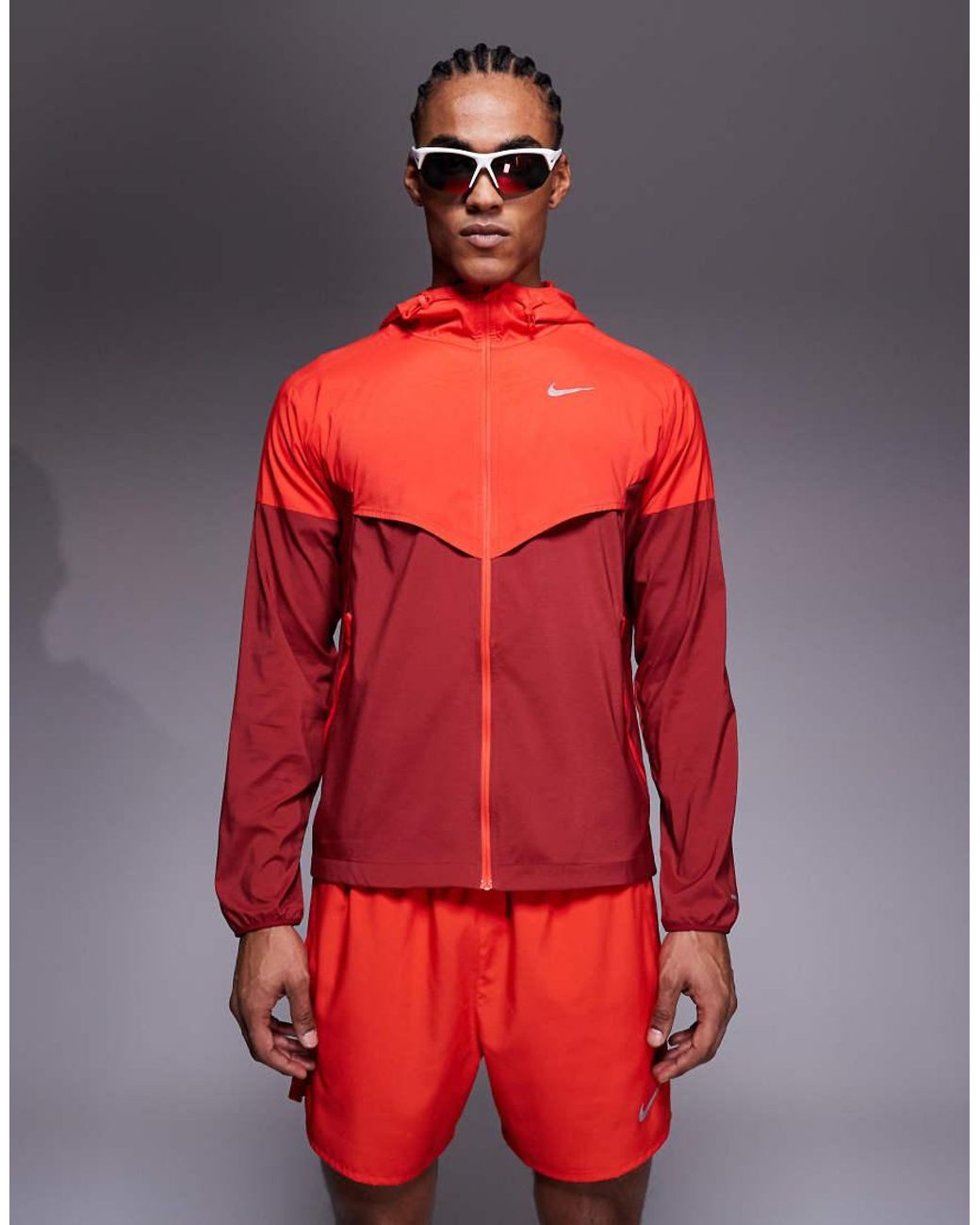 Chaquetas y abrigos de Nike Running Diseño color block Capucha fija Cuello alto Cierre de cremallera Bolsillos con cremallera Estampado de Nike en el pecho Corte estándar Color: rojo