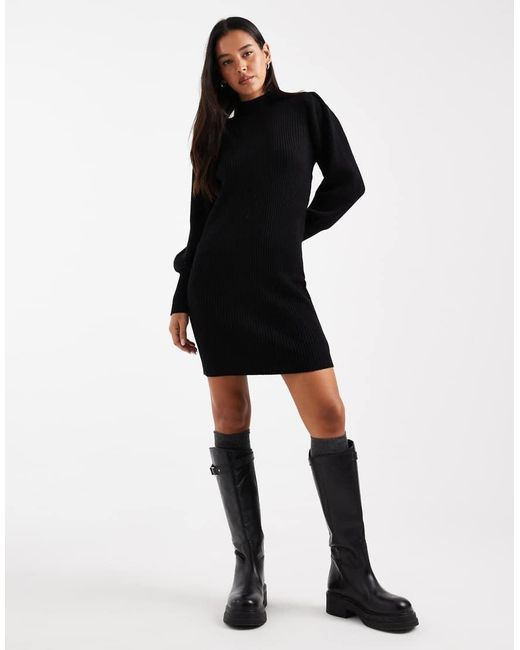 Vestido Corto Estilo Jersey Con Cuello Alto Y Mangas Abullonadas De de mujer de color negro