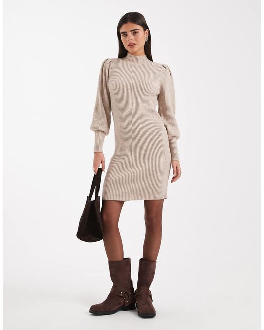 Vestido Estilo Jersey Con Mangas Abullonadas Y Cuello Alto De - Neutro